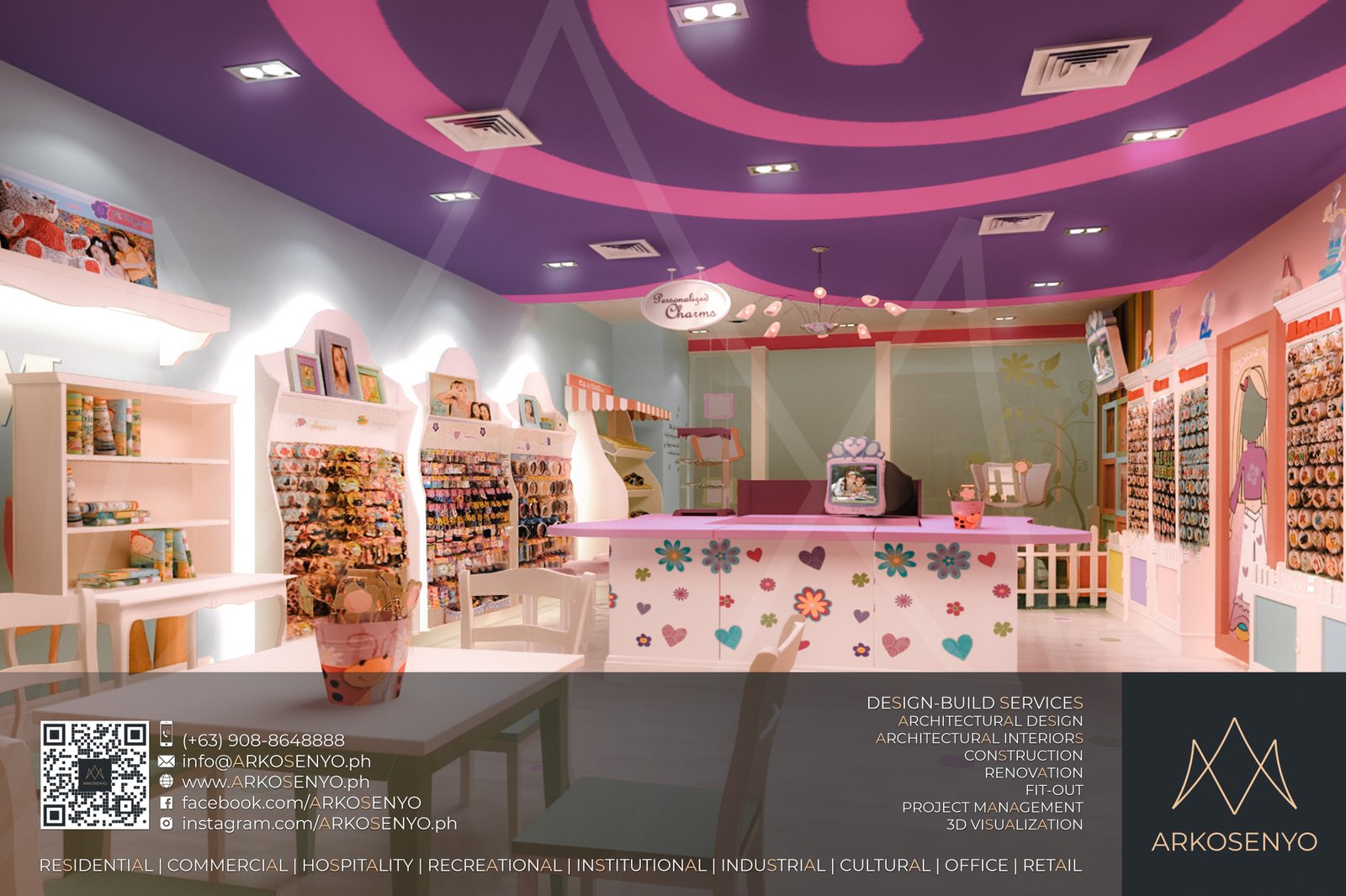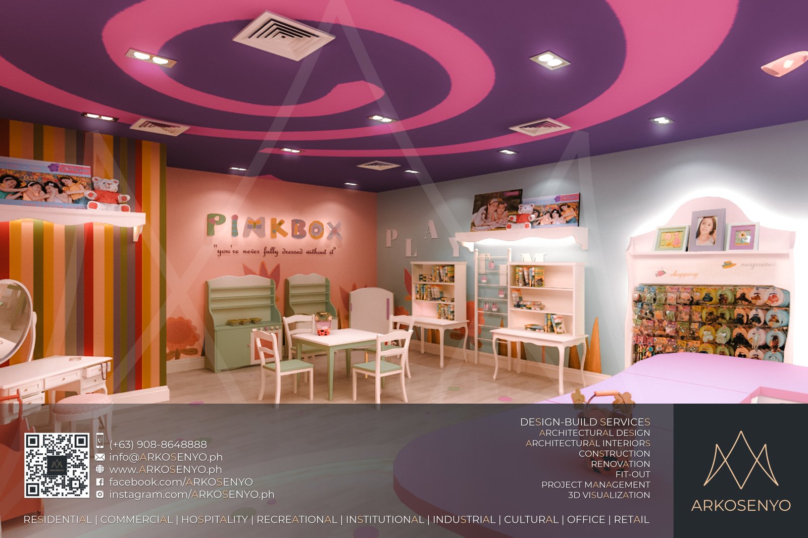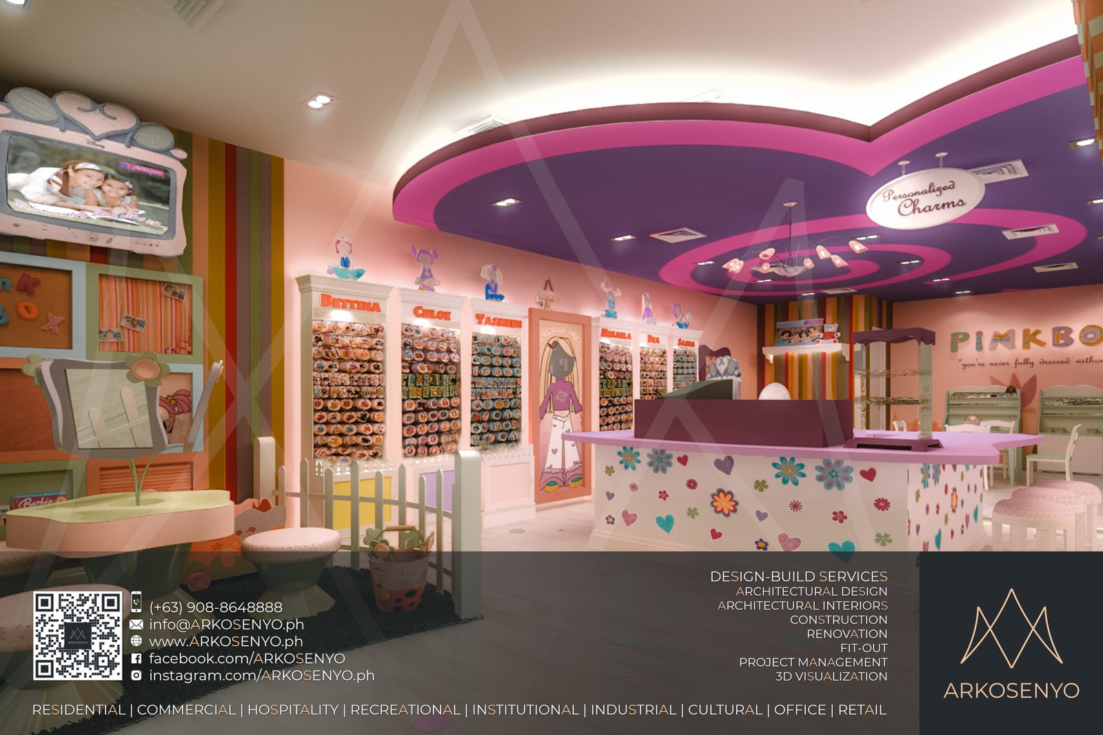 This project delves into the architectural interior design and 3D visualization of “Pink Box,” a retail store nestled within the bustling SM City Marikina shopping mall in the Philippines. Catering specifically to young girls, the design aims to create a whimsical and engaging environment that sparks their imagination and fosters a sense of wonder. The color palette embodies this spirit, with soft pink as the foundation, exuding warmth and welcoming energy. This gentle base is then adorned with accents of playful hues like lavender, sunshine yellow, and a touch of refreshing turquoise. This symphony of colors creates a visually stimulating experience, reminiscent of a delightful candy store or a magical fairyland.